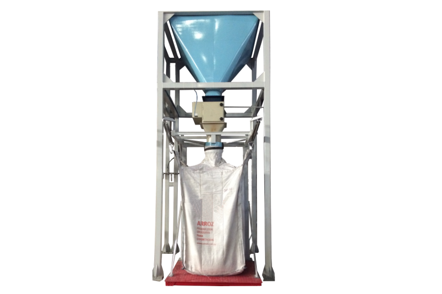 Topes de apertura ajustables en el campo. Se incluye un cono de transición de salida del alimentador de arroz a la boca de carga del Big Bag de aprox. 300 mm