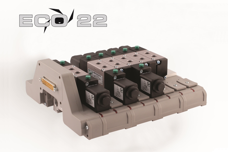 La serie ECO 22 de electroválvulas de Pneumax, se caracteriza por sus excelentes prestaciones, versatilidad, dimensiones reducidas y un precio muy competitivo. En el cuerpo en aluminio del distribuidor se desplaza, con bajo rozamiento, una corredera con las juntas de estanqueidad montadas sobre ella que permite optimizar al máximo tanto el caudal como la rapidez de reacción de la válvula. La serie está realizada con conexiones de utilización de G1/8” y G1/4” en las versiones 3/2, 5/2 y 5/3, monoestables o biestables según las versiones y el tipo de reposicionamiento (eléctrico o muelle). Distintos niveles de conexionado y opciones de automatización.